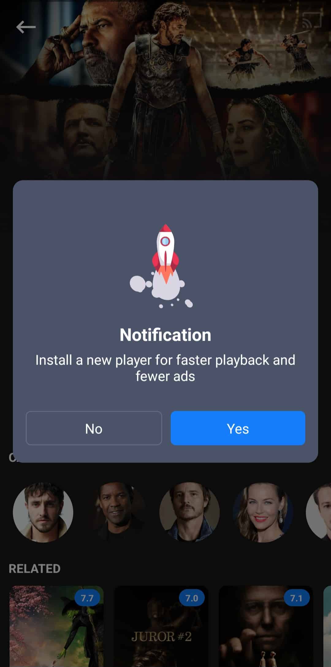 Most of the times while using the HDO Box APK, user normally faces the error and problem simultaneously you can see in the image below. Whenever you see the pop up saying “Install a new player for faster playback and fewer ads” Then tap on “Yes”. This will take you to the additional player on Playstore or App Store which means you will further install the additional player.